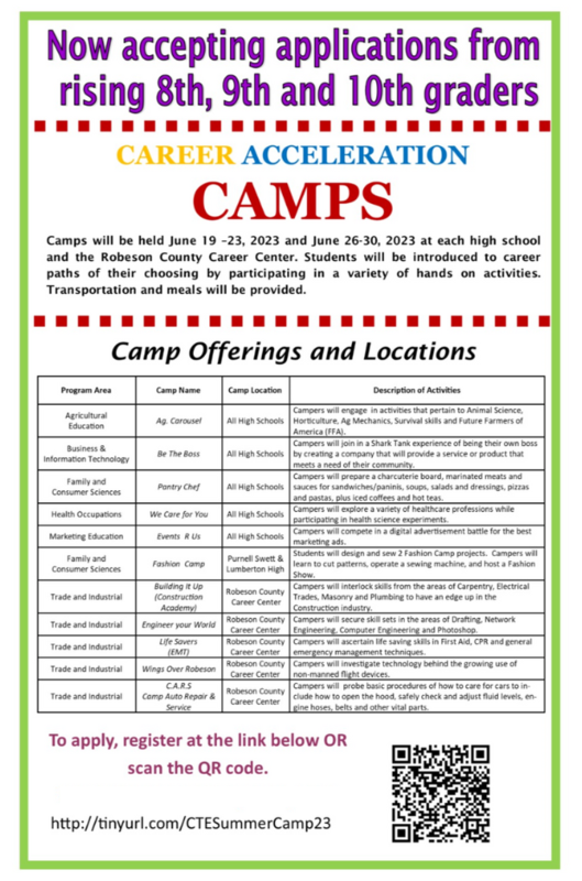 Camps will be held June 19-23 and June 26-30 at each high school and the Robeson County Career Center. The deadline to register is Friday!