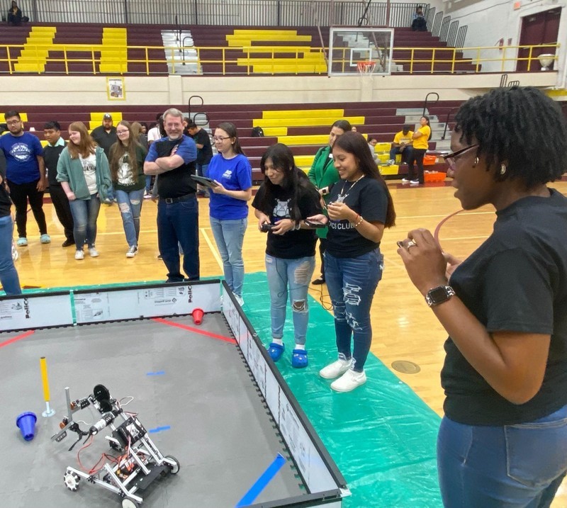 Beatriz Trujillo, a St. Pauls High School eleventh grader and member of the school’s Tech Titans Robotics Team, controls the team’s robot Wednesday during the Public Schools of Robeson County’s inaugural High School Robotics Expo at Lumberton Senior High School.