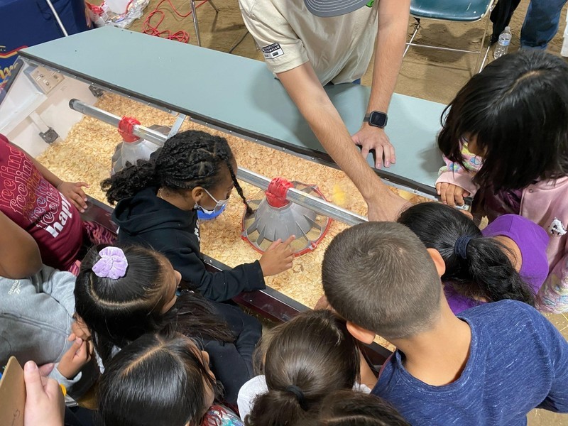 Students smiled as they participated in activities like grinding flour and as they marveled at baby chicks at another educational booth.