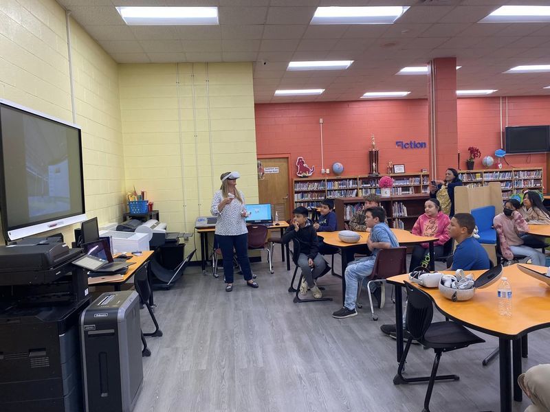Students gathered in the school’s media center to watch a demonstration of a virtual simulated oil change in which Johnnie Lynn, State Workforce Manager with Transfr, participated in a prompt that allowed her to change the oil of a vehicle. The demonstration was cast to a SmartBoard, which allowed students to watch the virtual simulation as Lynn and other students participated.